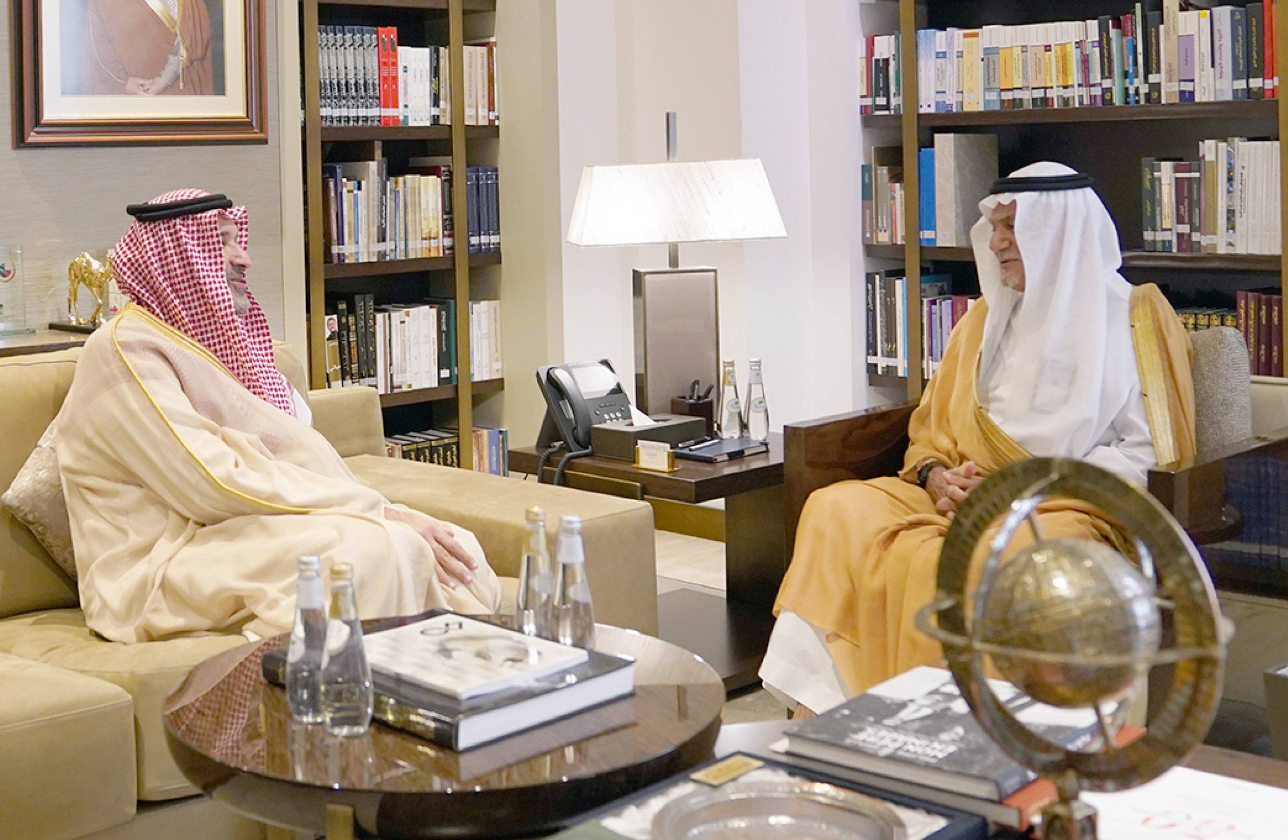 费萨尔国王学术与伊斯兰研究中心主席图尔基·费萨尔亲王在其办公室会见萨勒曼国王私人顾问、阿卜杜勒阿齐兹国王馆董事会主席、法赫德国王国家图书馆理事会主席费萨尔·本·萨勒曼·本·阿卜杜勒阿齐兹·阿勒沙特亲王。
